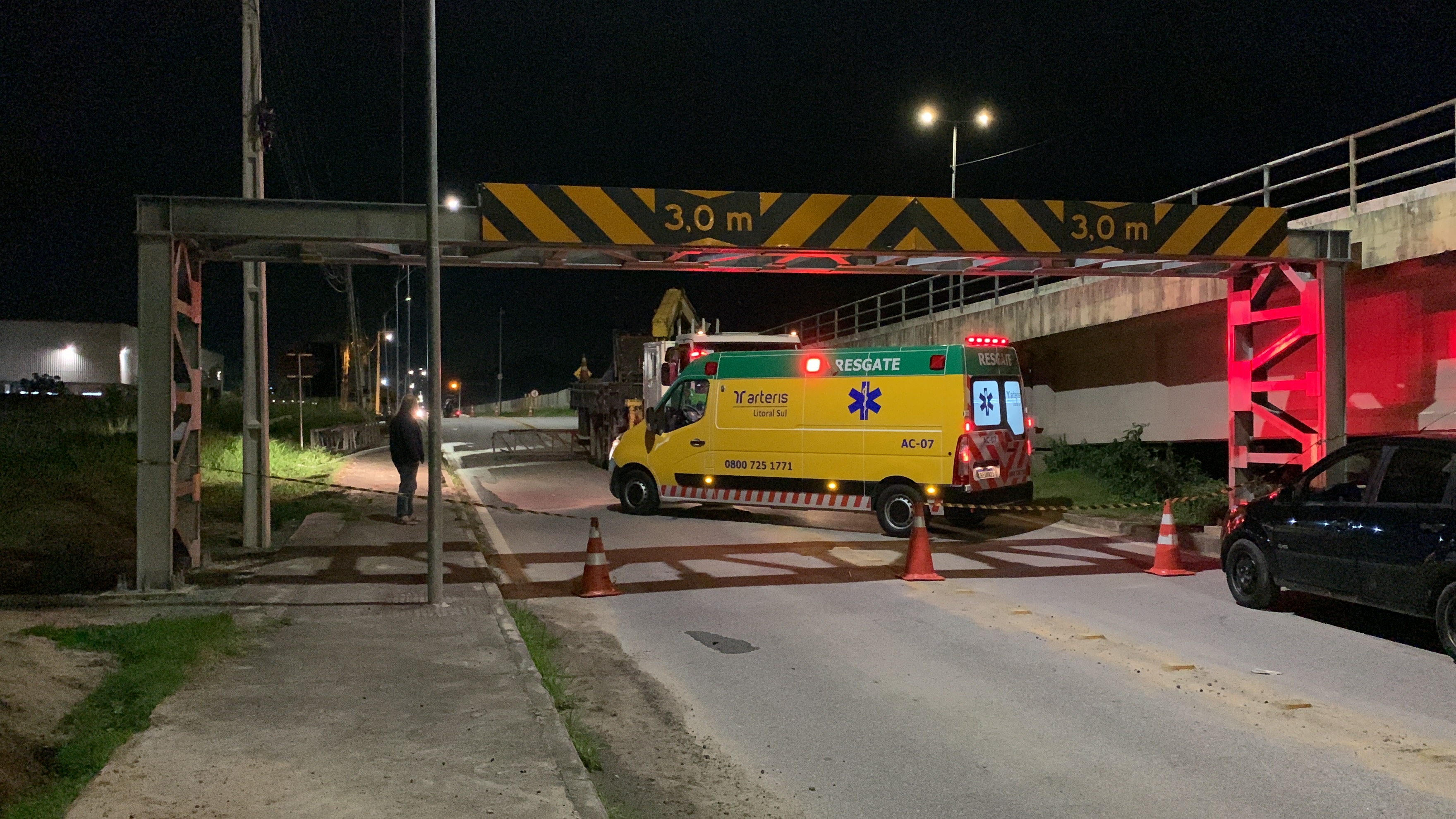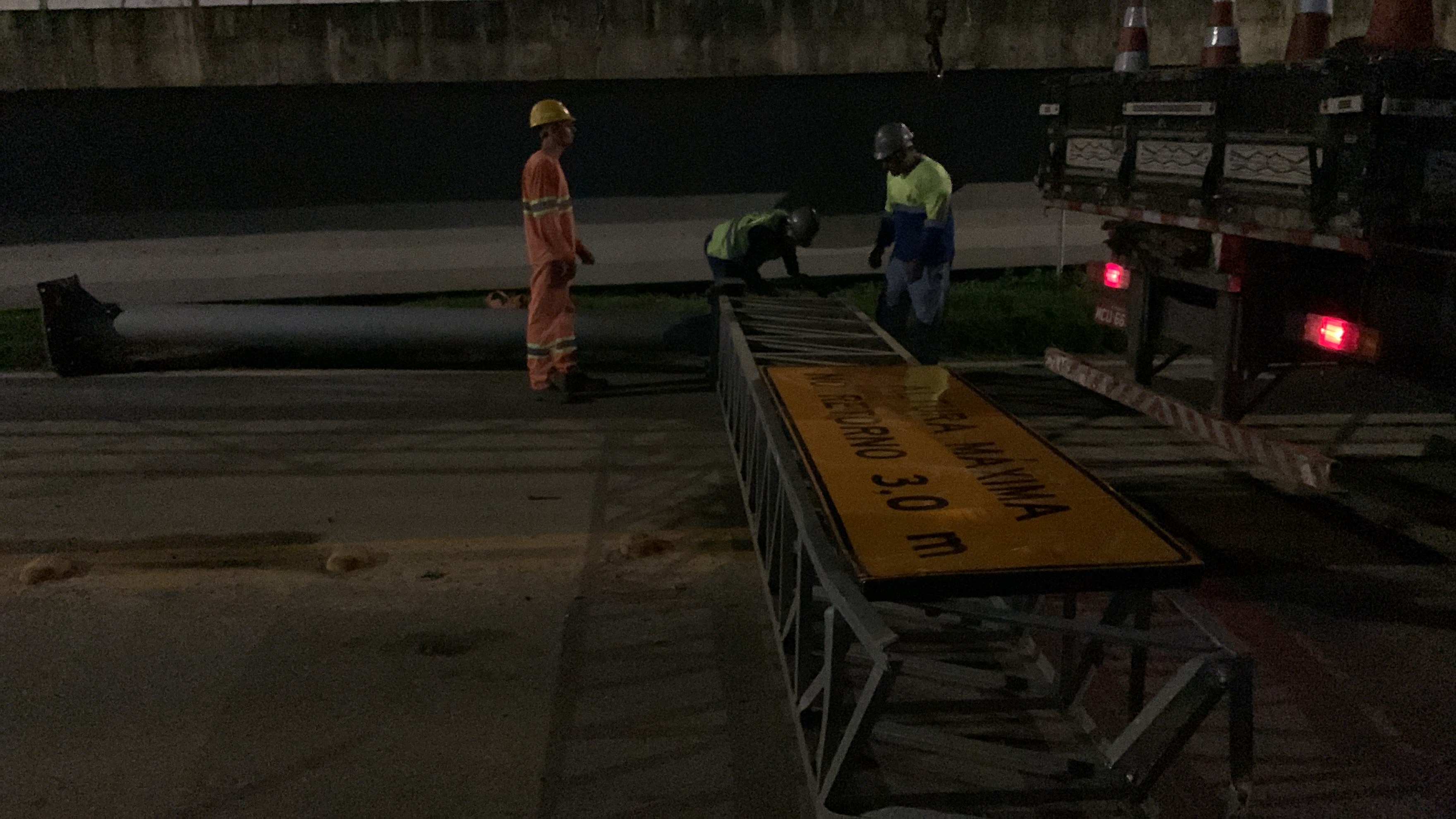 Tudo isso porque, um caminhão tentou e forçou passagem, derrubando a placa que limita a altura no local. O indicativo é de apenas 3 metros.