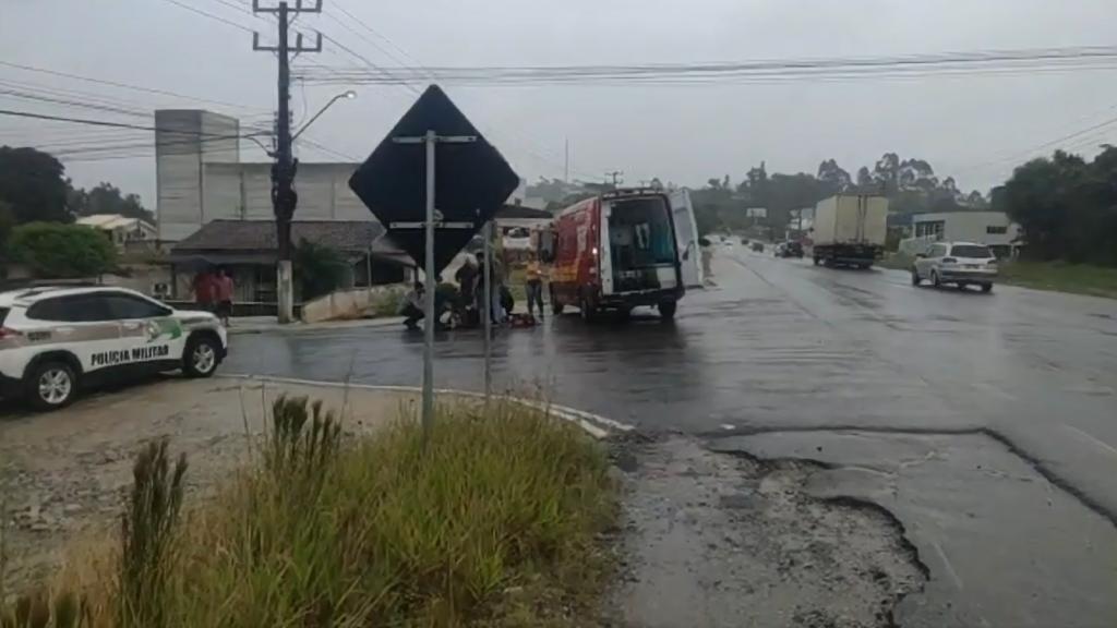 Um acidente envolvendo um veículo Palio e uma moto Honda XRE interrompeu o fluxo na SC-410, na cidade de Canelinha, nesta quarta-feira, 03 de janeiro, por volta das 10h15. O motociclista, após o impacto, ficou no chão consciente, apresentando escoriações visíveis, suspeita de fratura na perna e sangramento na mão.