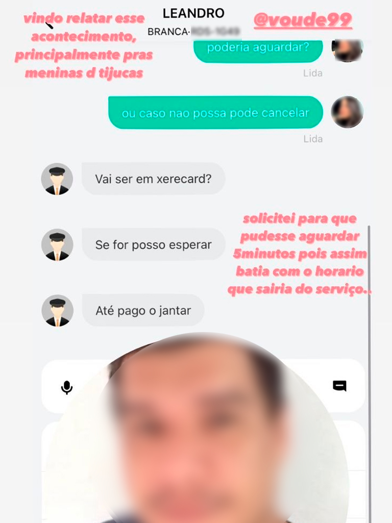 Diante da situação, a vítima realizou capturas das mensagens enviadas pelo motorista e publicou marcando a plataforma.