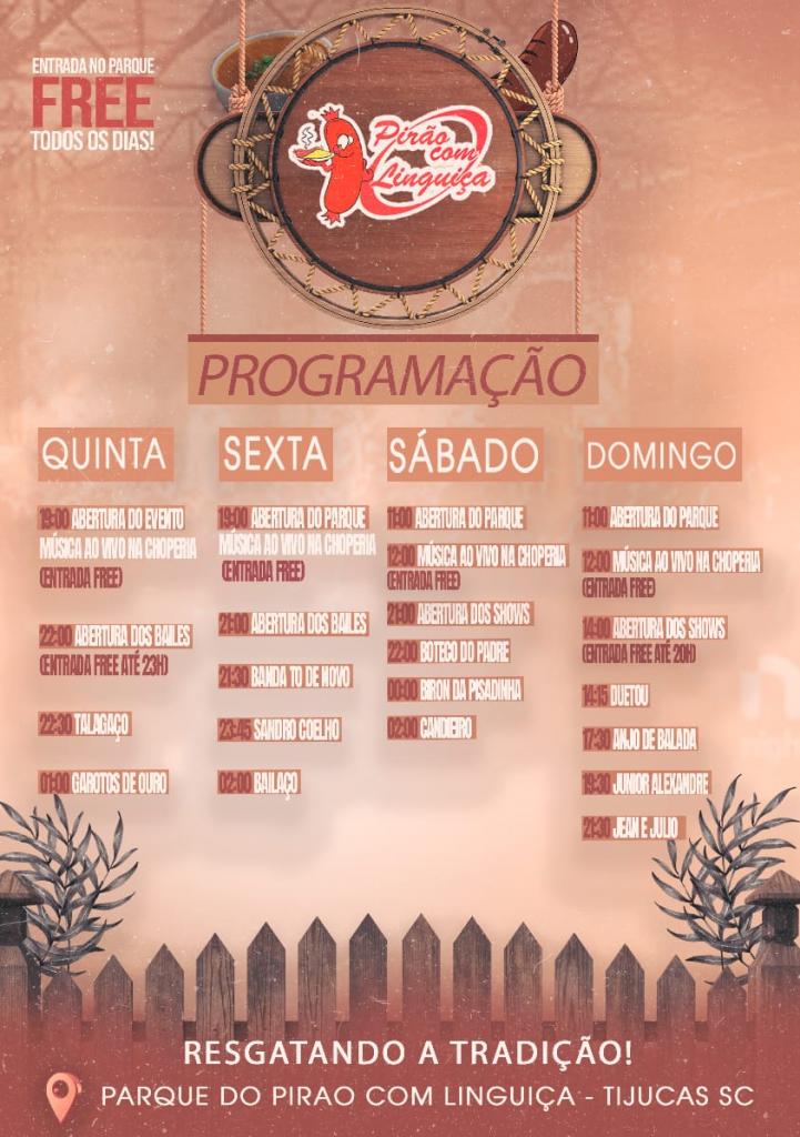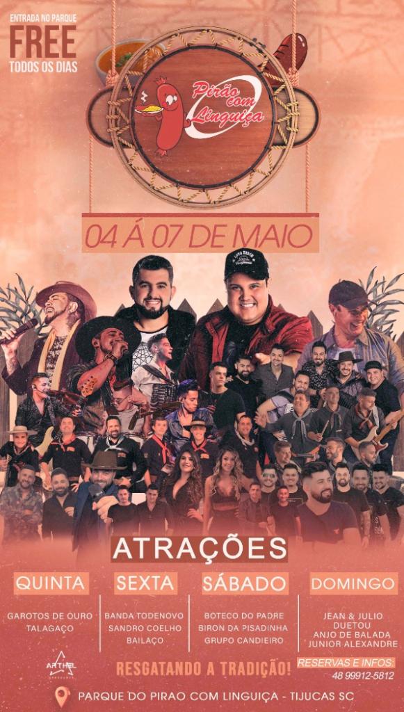 Após nove anos de espera, Tijucas recebe novamente a tradicional Festa do Pirão com Linguiça. O evento começou na quinta e vai até domingo, 7 de maio, no Parque do Pirão com Linguiça. Os primeiros dias já foram considerados de sucesso.