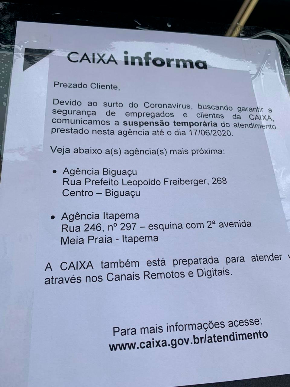 Após ter um caso de Covid-19 confirmado entre os funcionários da agência da Caixa Econômica Federal de Tijucas, a unidade bancária passará por uma desinfecção e portanto, ficará fechada nesta segunda-feira, 15 de junho.