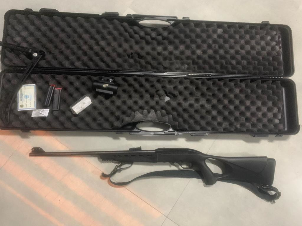 A arma foi encontrada na casa dos envolvidos, dentro de uma maleta, juntamente com vinte munições intactas calibre 22, uma luneta, dois carregadores, um tripé e a documentação do registro da arma, que estava atrás do sofá da sala.