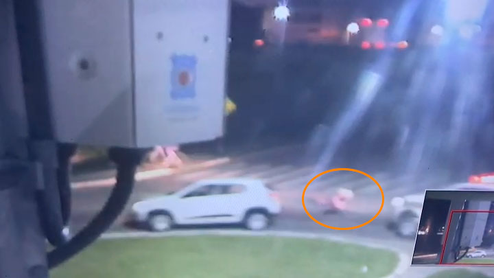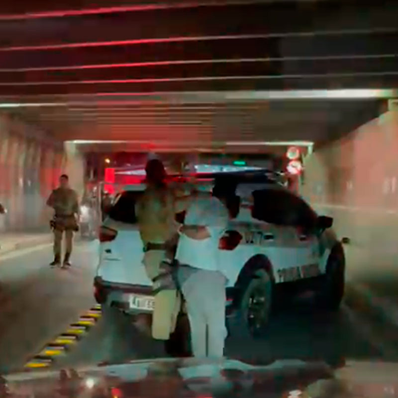Havia uma mulher no banco traseiro, ela colocava os braços para fora da janela e próximo da rotatória se jogou do veículo em movimento. Dentro do viaduto uma outra viatura fechou o automóvel perseguido e houve uma colisão. Os dois ocupantes foram detidos. A mulher caída na pista apresentava leves escoriações e também foi detida.