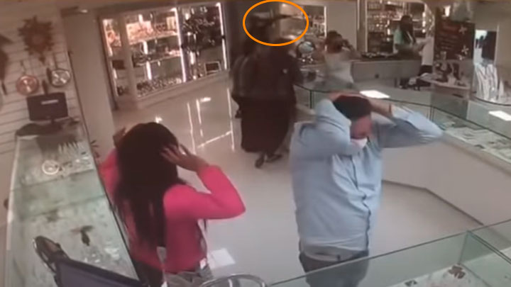 Já nas novas imagens divulgadas, é possível perceber que uma mulher de blusa rosa e um homem de camisa clara estão conversando com uma das atendentes e olhando alguns produtos da loja, neste momento o homem de preto anuncia o assalto indicando estar armado, o casal simula serem vítimas e também coloca as mãos para o alto.