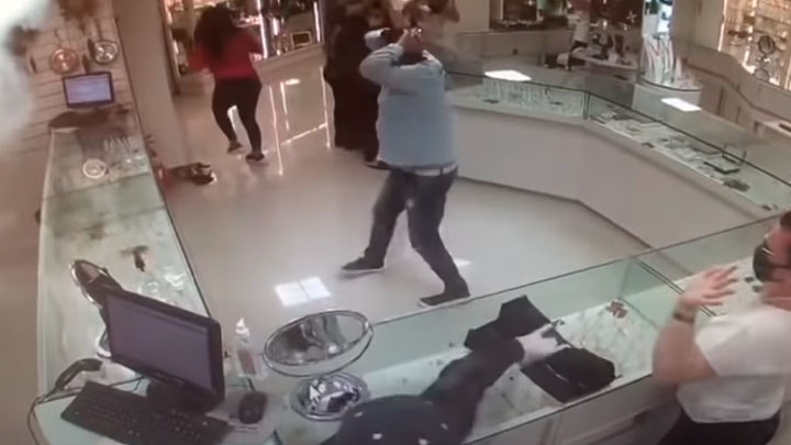Novas imagens do assalto em uma joalheria, ocorrido no fim da tarde desta terça-feira, 24 de agosto, mostram com detalhes a ação dos criminosos. As imagens são da câmera de segurança interna do estabelecimento.