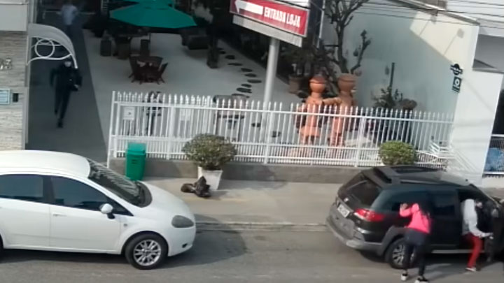 Enquanto o homem de preto pega os produtos que o casal olhava, eles aproveitam para fugir, a mulher inclusive deixa sua bolsa no chão ao ir para a saída. Já no carro um último homem, de calça vermelha, também vem do interior da loja.