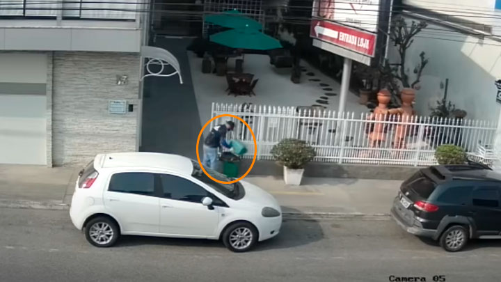 Em seguida, sai do automóvel outro homem, vestindo jaqueta azul marinho com detalhes brancos e calça jeans clara, este ainda retorna e pega o saco de lixo de uma lixeira em frente ao portão de acesso da joalheria, neste momento, ao perceber os companheiros já voltando para o veículo, nem chega a entrar no comércio.