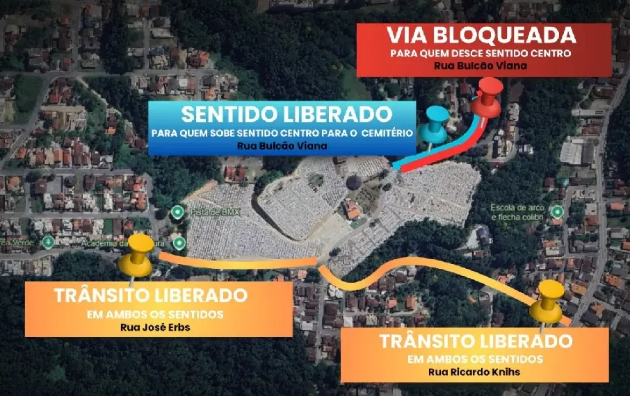 Durante todo o domingo, ficará proibido o tráfego em direção ao Centro pela Rua Bulcão Viana, no trecho de descida. O acesso ao cemitério continuará liberado normalmente pelas ruas Ricardo Knihs e José Erbs.