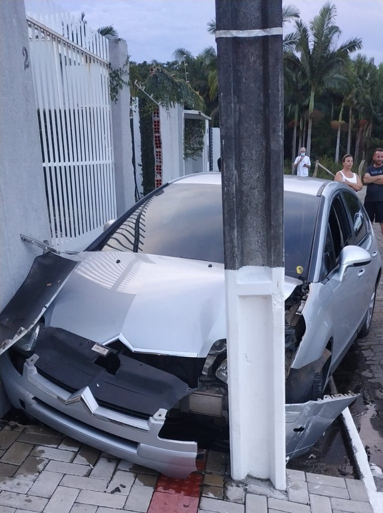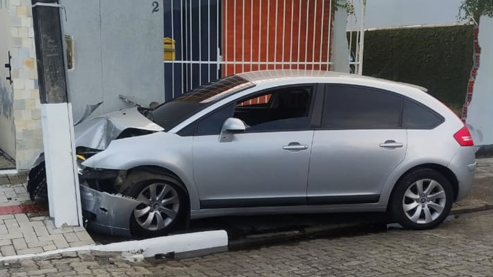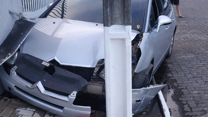 O carro, que estava em alta velocidade, só parou quando ficou preso entre o poste e um muro da residência, antes destruiu outra parte do muro e também o portão.