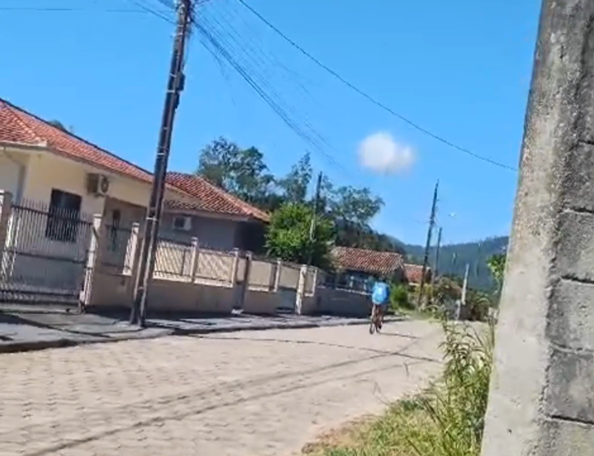 A Polícia Militar de Canelinha está em busca do suspeito, descrito como um homem idoso vestindo uma camisa azul.