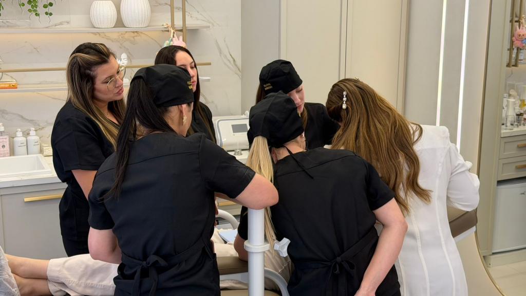 Durante o encontro, as participantes acompanharam etapas práticas com pacientes modelos, que contribuem para a experiência real de aplicação dos procedimentos em contexto clínico supervisionado. A proposta do programa é capacitar as profissionais para um entendimento aprofundado da anatomia facial, precisão de técnicas e construção de resultados naturais e personalizados.