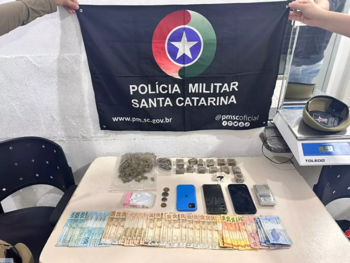 Na revista veicular, foi localizada uma bolsa contendo cerca de 320 gramas de maconha, divididas em 13 porções, aproximadamente 104 gramas de skunk, 7 gramas de haxixe, além de balança de precisão, embalagens tipo zip, três celulares e R$ 1.933,80 em dinheiro. Diante dos indícios, o motorista recebeu voz de prisão.