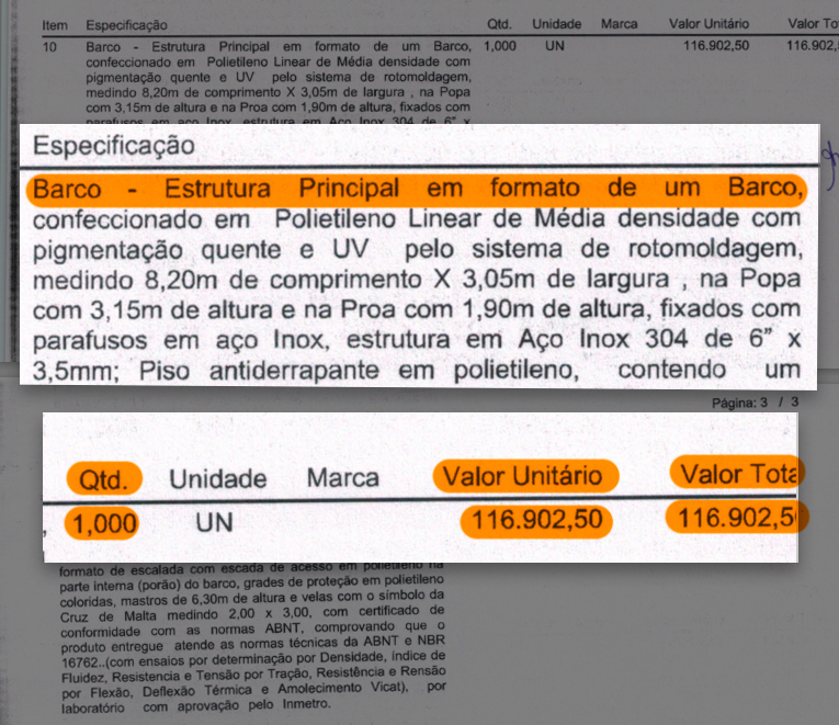 Na licitação para compra do brinquedo, a administração municipal investiu uma quantia superior aos R$ 116 mil. No documento, há requisitos como altura e material usado na fabricação, piso antiderrapante e decorações que remetem às tradicionais caravelas.