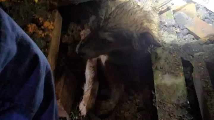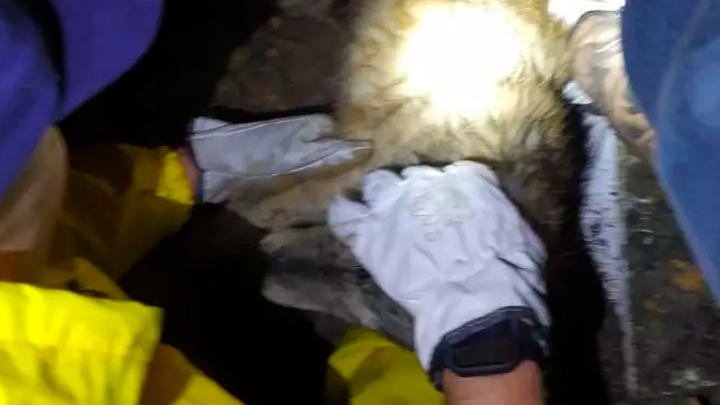 Após utilizar diversas ferramentas os bombeiros conseguiram escorar parte do muro e quebrar pedaços de concreto que cobriam o animal.