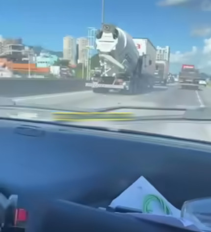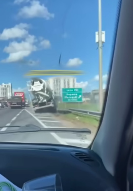 É possível perceber que o motorista de um caminhão betoneira, que seguia na pista da esquerda, após colidir na traseira de um outro caminhão, que freou na sua frente, desvia e colide no guard-rail, na margem direita. Devido a velocidade e a violência do impacto, por muito pouco o caminhão não tombou na pista