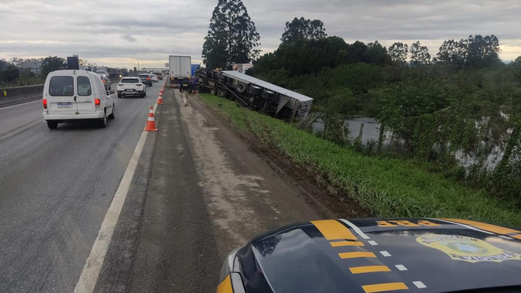 Um caminhão tombou no km 156 da BR-101, sentido sul, entre Tijucas e Porto Belo na tarde desta quarta-feira, 27 de setembro.