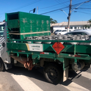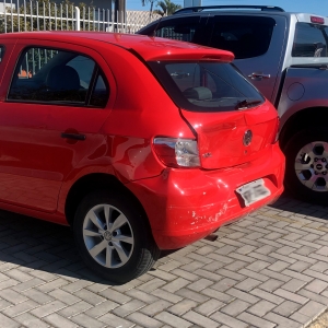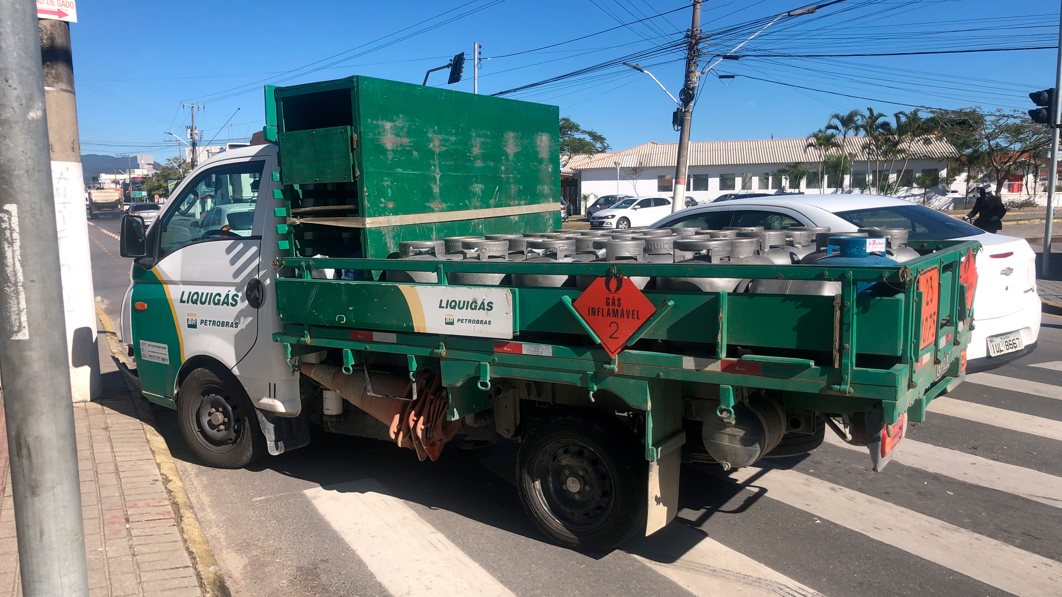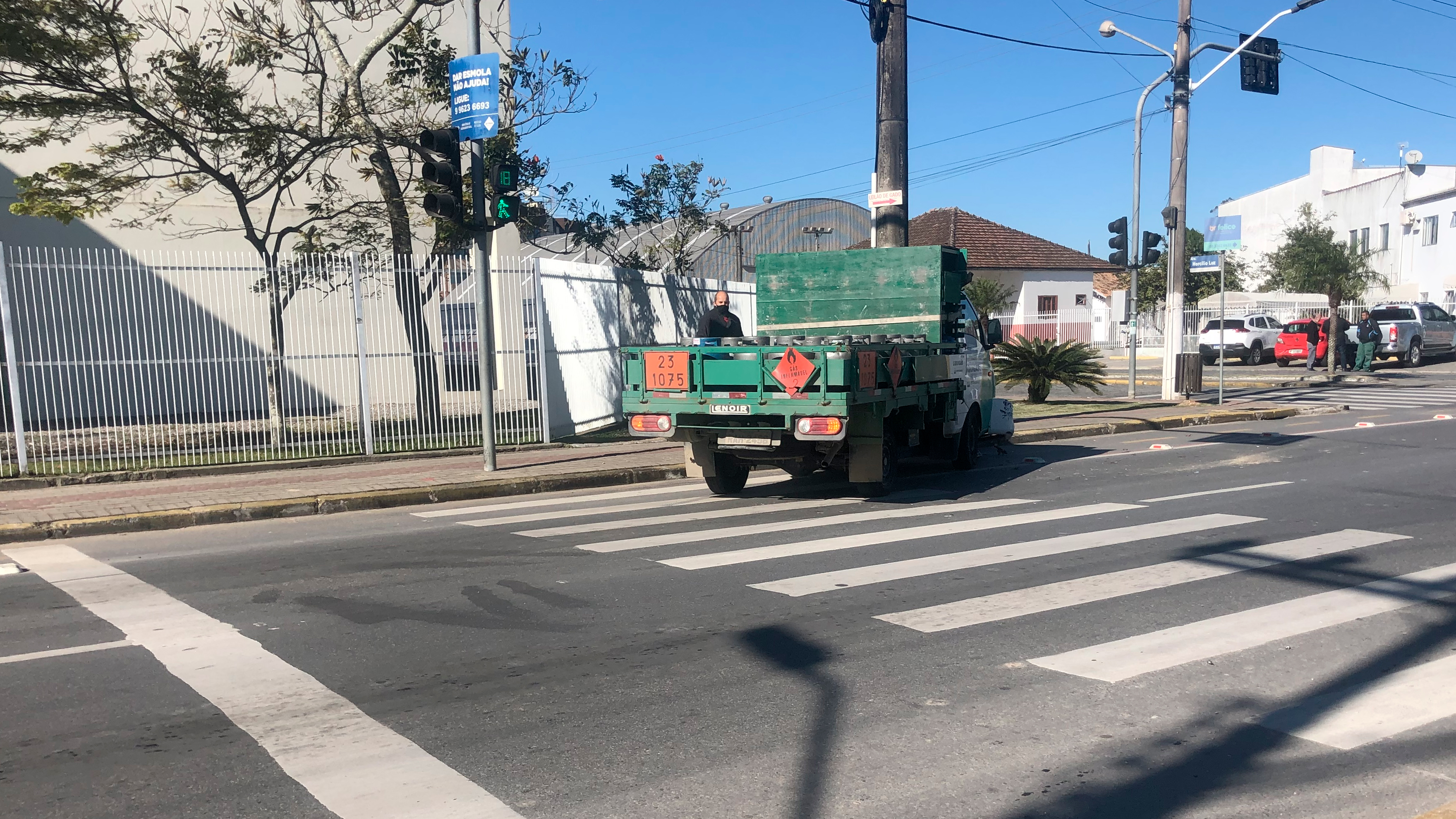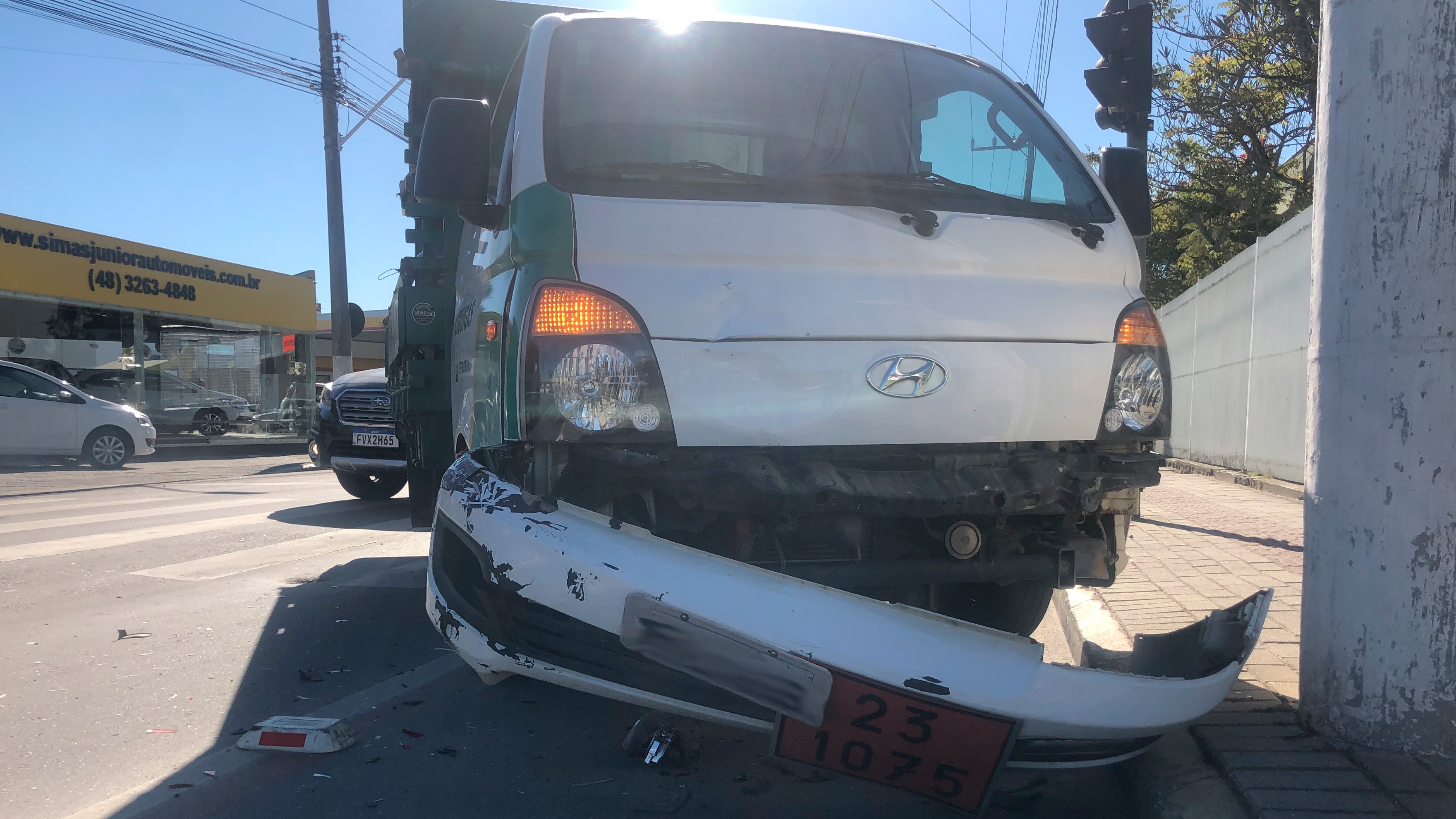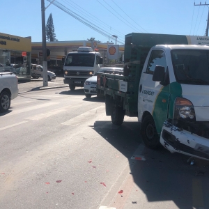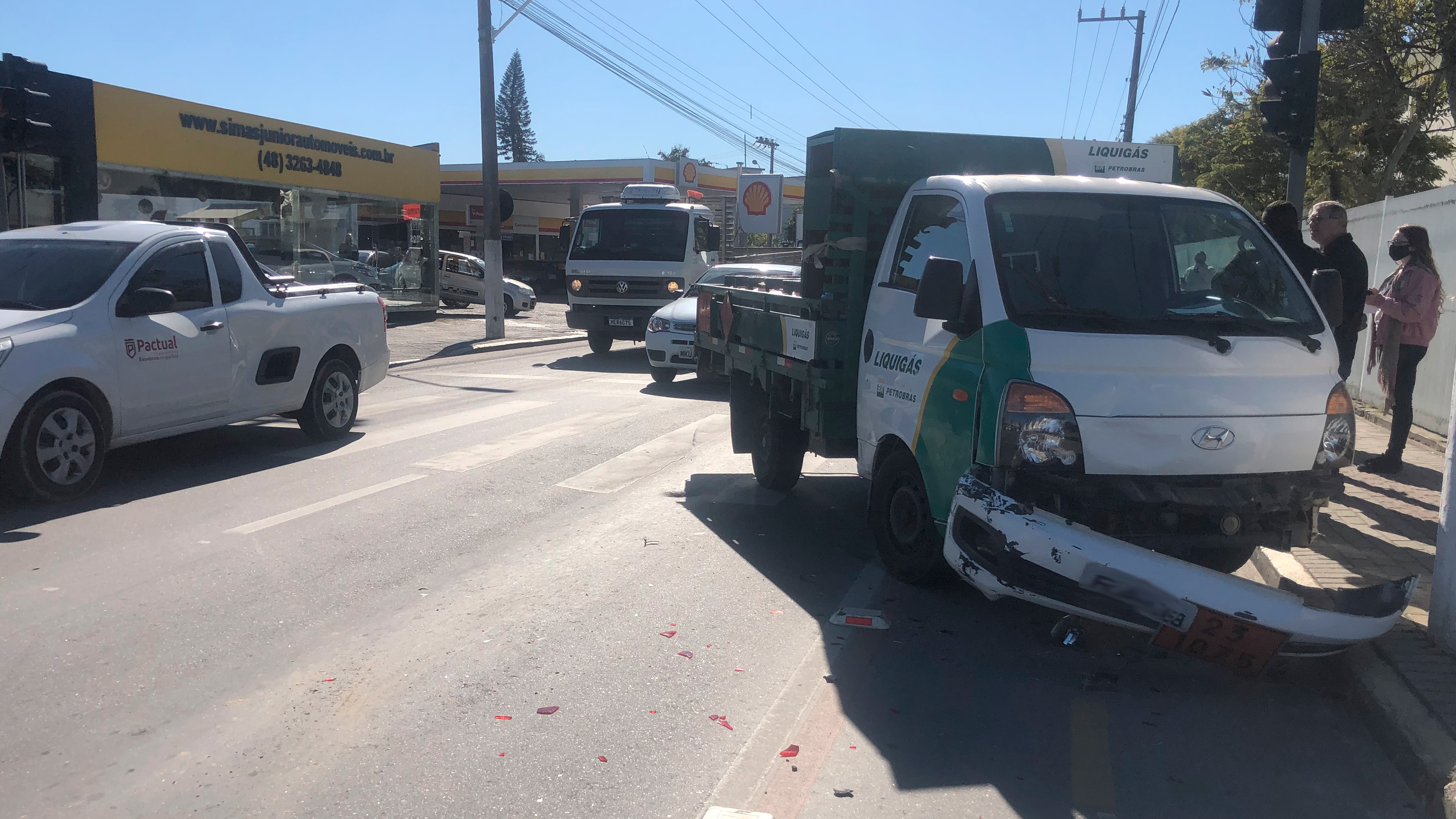 Um caminhão Hyundai/HR, carregado com botijões de gás, colidiu na traseira de um VW/Gol e atingiu um motociclista. De acordo com o motorista, o carro teria parado em sua frente, mesmo com o sinal aberto.