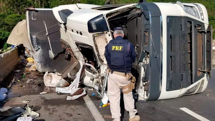 Uma carreta com placas de Brusque se envolveu em um grave acidente, nesta segunda-feira, 04 de abril, em Campina Grande do Sul, no Paraná. O tombamento ocorreu em um trecho da BR-116 e terminou com a morte de uma mulher, passageira do veículo.