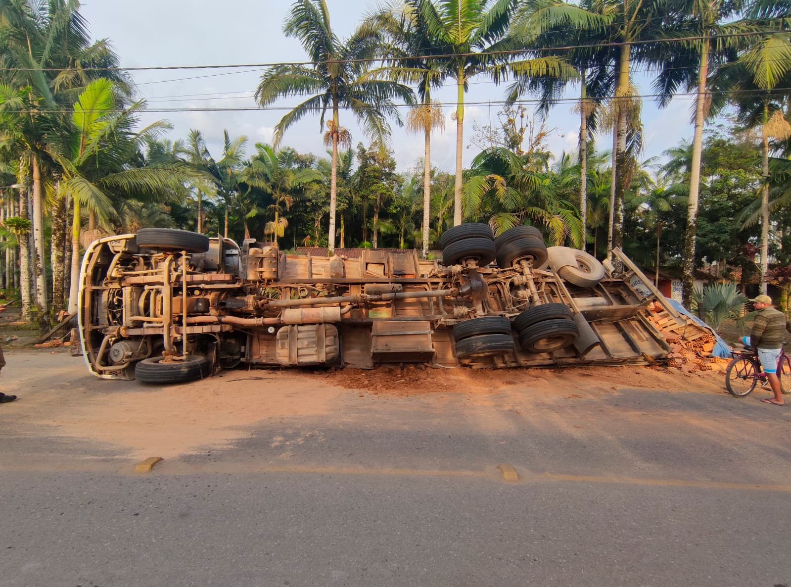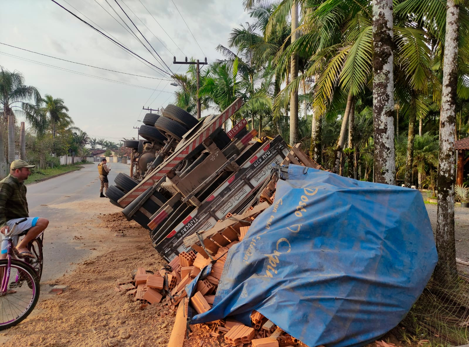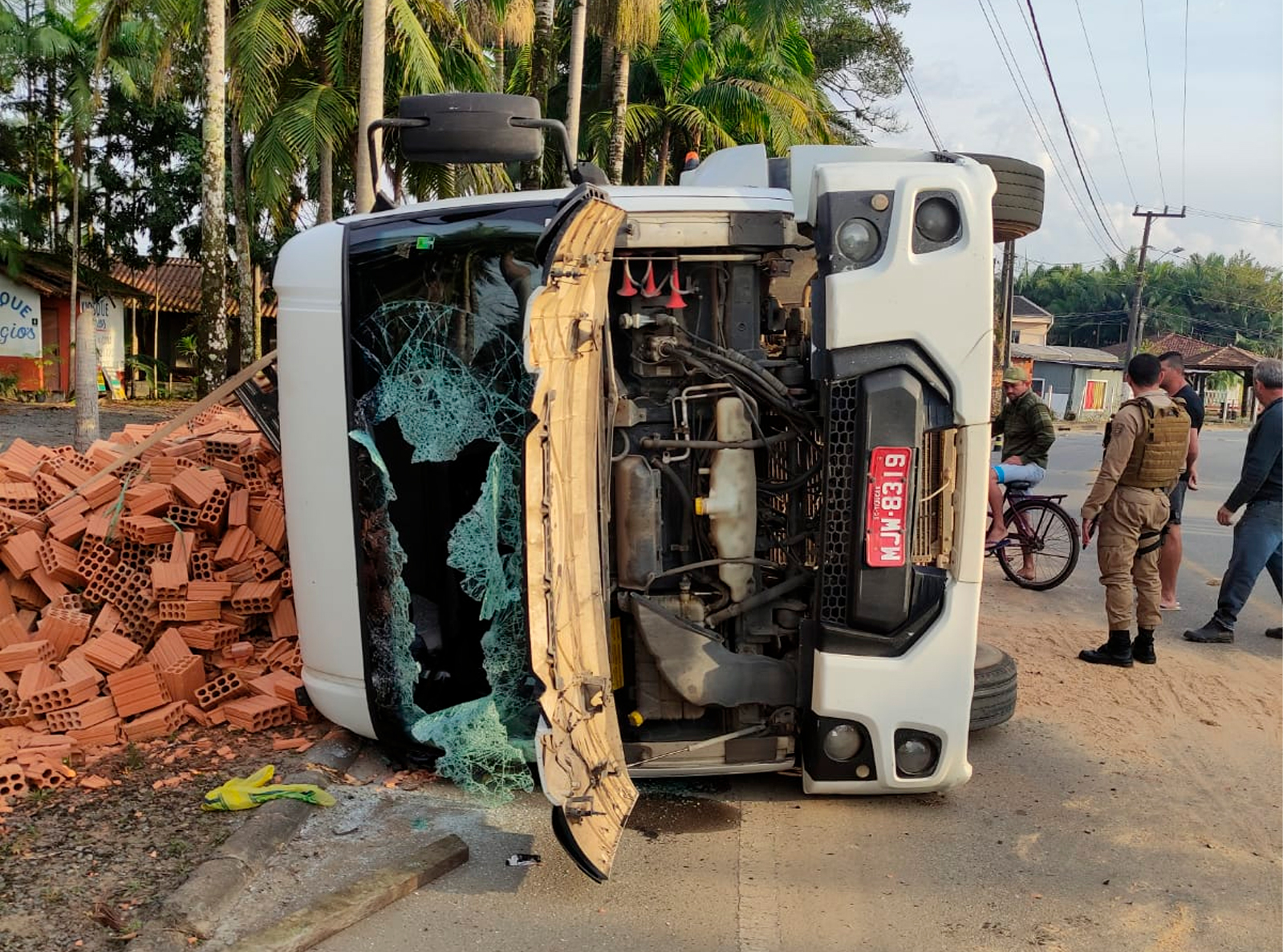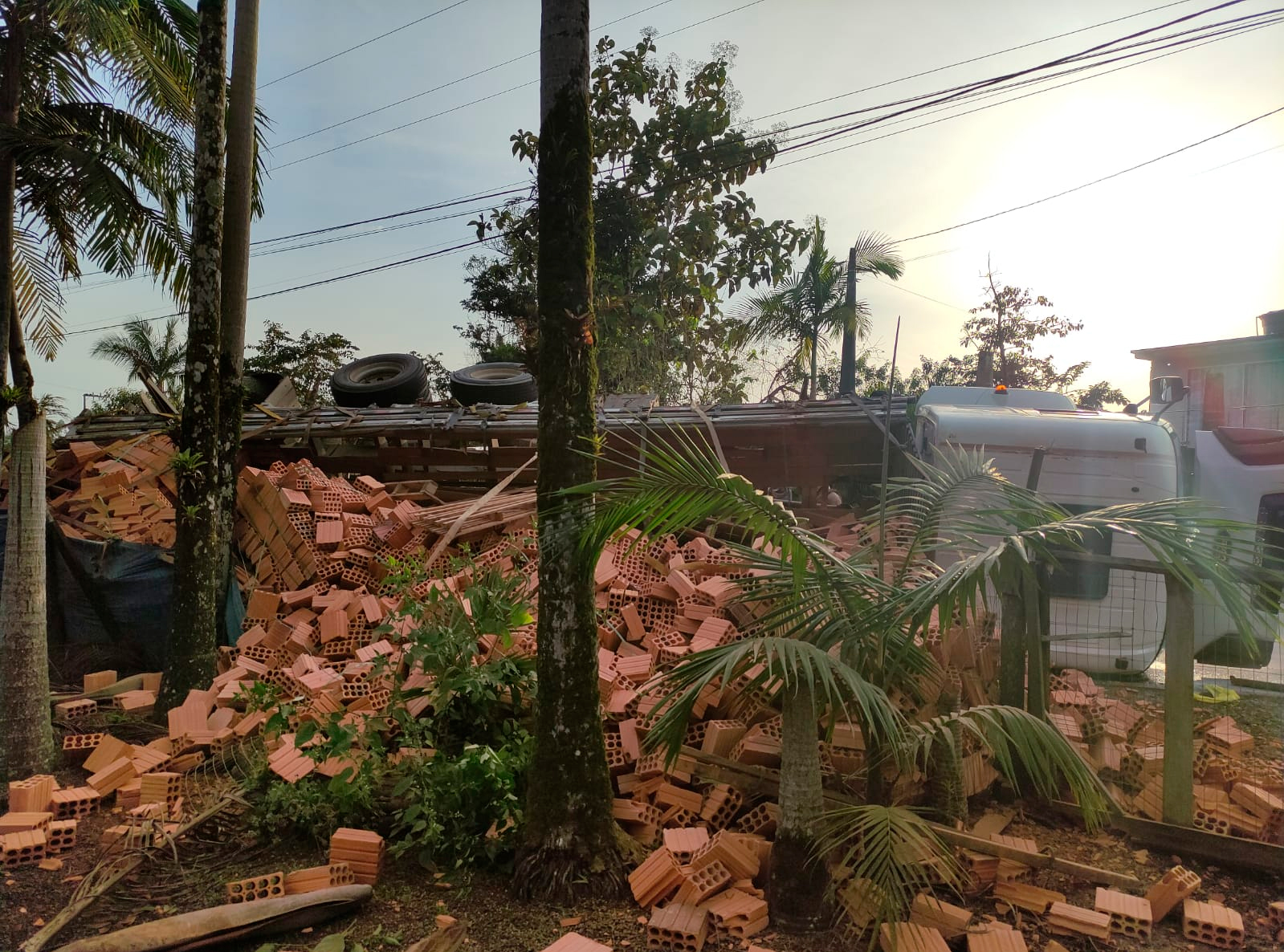 Toda a carga de tijolos ficou espalhada sobre uma grade, ao lado da estrada, enquanto o veículo ficou deitado e bastante danificado. Apesar do grande susto, não houve registro de feridos.