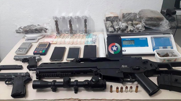 Além dos entorpecentes havia 04 munições de calibre .40 e 02 munições de calibre .38, 02 simulacros de pistola e 01 simulacro de fuzil. No pátio da casa foram localizadas duas bicicletas de alto valor com origem duvidosa. O casal foi preso em flagrante e o amigo foi levado para a delegacia como testemunha.