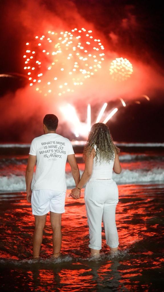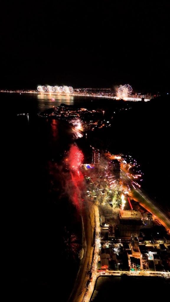 A queima de fogos teve duração de cerca de 12 minutos e foi realizada a partir de seis balsas flutuantes posicionadas estrategicamente no mar, quatro na Meia Praia e duas na região Central, garantindo ampla visibilidade em toda a extensão da orla. O show apresentou um formato diferenciado, com novos efeitos visuais e uma proposta inédita para a virada.