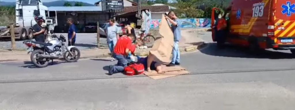 Uma mulher ficou ferida na tarde desta terça-feira, 12 de setembro, em São João Batista, após se envolver em um acidente no trevo de acesso a nova ponte, entre os Bairros Ribanceira do Sul e Cardoso. A vítima, em uma bicicleta, colidiu contra uma moto.