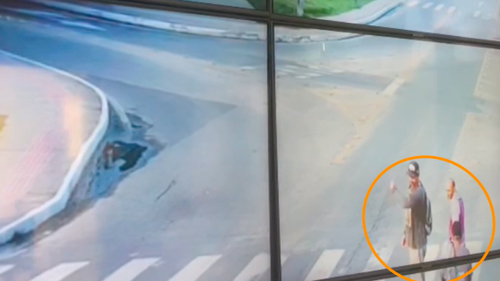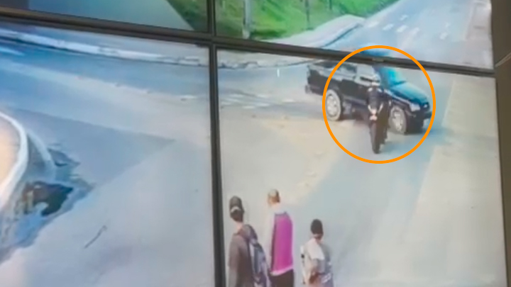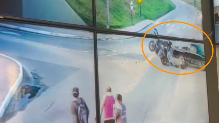 Uma das câmeras do sistema de monitoramento da Polícia Militar captou o momento em que uma motocicleta e uma caminhonete colidiram na marginal oeste da BR-101, em Itapema.