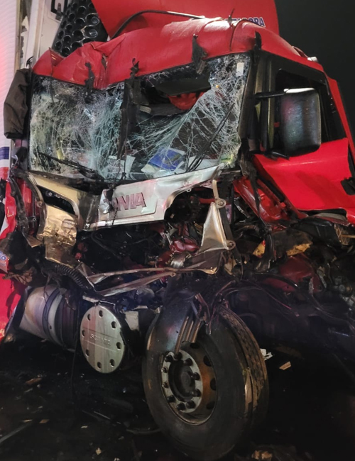O condutor da Scania estava consciente e orientado, seus sinais vitais estavam estáveis. Ele apresentava suspeita de fratura na perna esquerda e suspeita de hemorragia interna. Após os primeiros socorros ainda no local, foi conduzido ao hospital.
