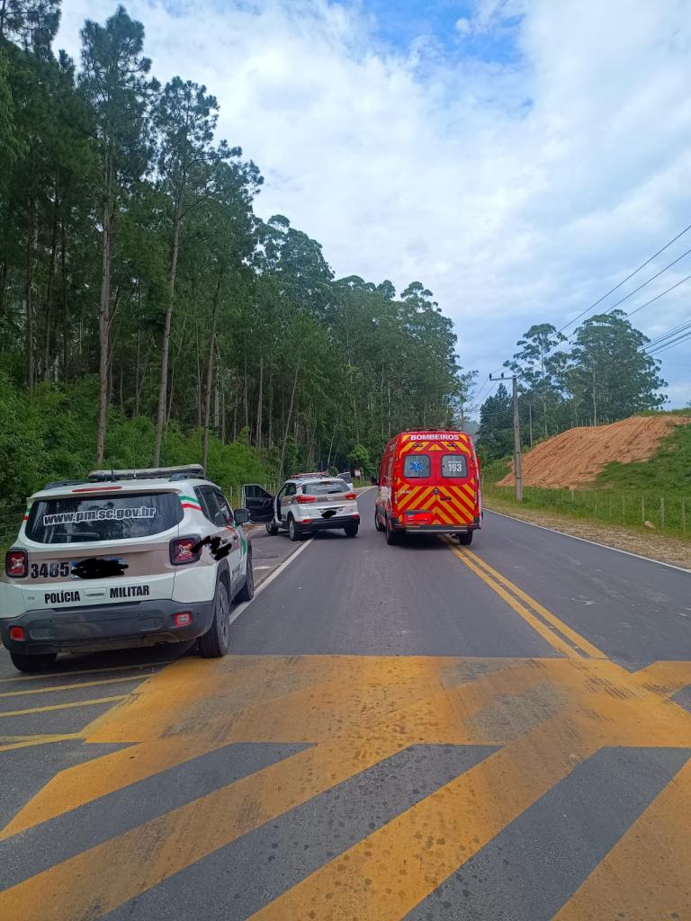 Um acidente de trânsito envolvendo uma motocicleta e uma viatura da Polícia Militar deixou um homem ferido na manhã desta quinta-feira, 29 de janeiro, na Estrada Geral do Timbé, no município de Tijucas.