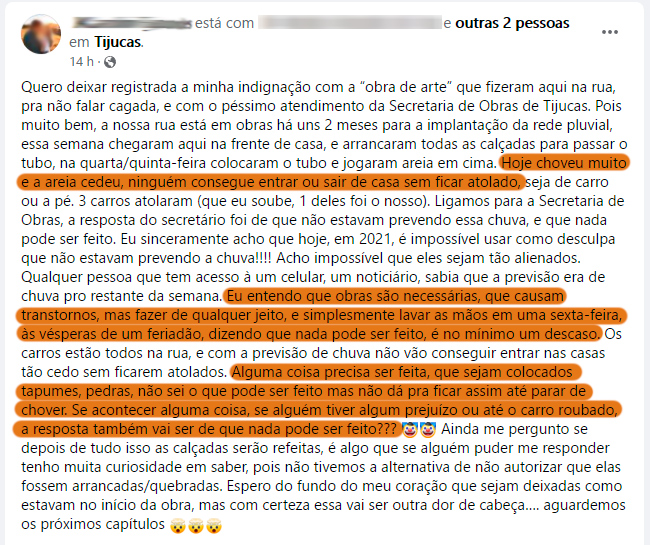 Segundo o relato de uma das afetadas, as equipes da Secretaria de Obras e Serviços fizeram a retirada das calçadas para passagem de tubos para a implantação da rede pluvial. Após a colocação dos canos, foram despejadas algumas camadas areia para permitir a passagem de carros e pedestres.