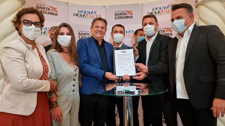 O prefeito Pedro Alfredo Ramos, o Pedroca, esteve no Palácio d’Agronômica, a residência oficial do governador Carlos Moisés, para assinar o convênio e oficializar o repasse da verba, junto dos representantes de outras 17 cidades catarinenses.