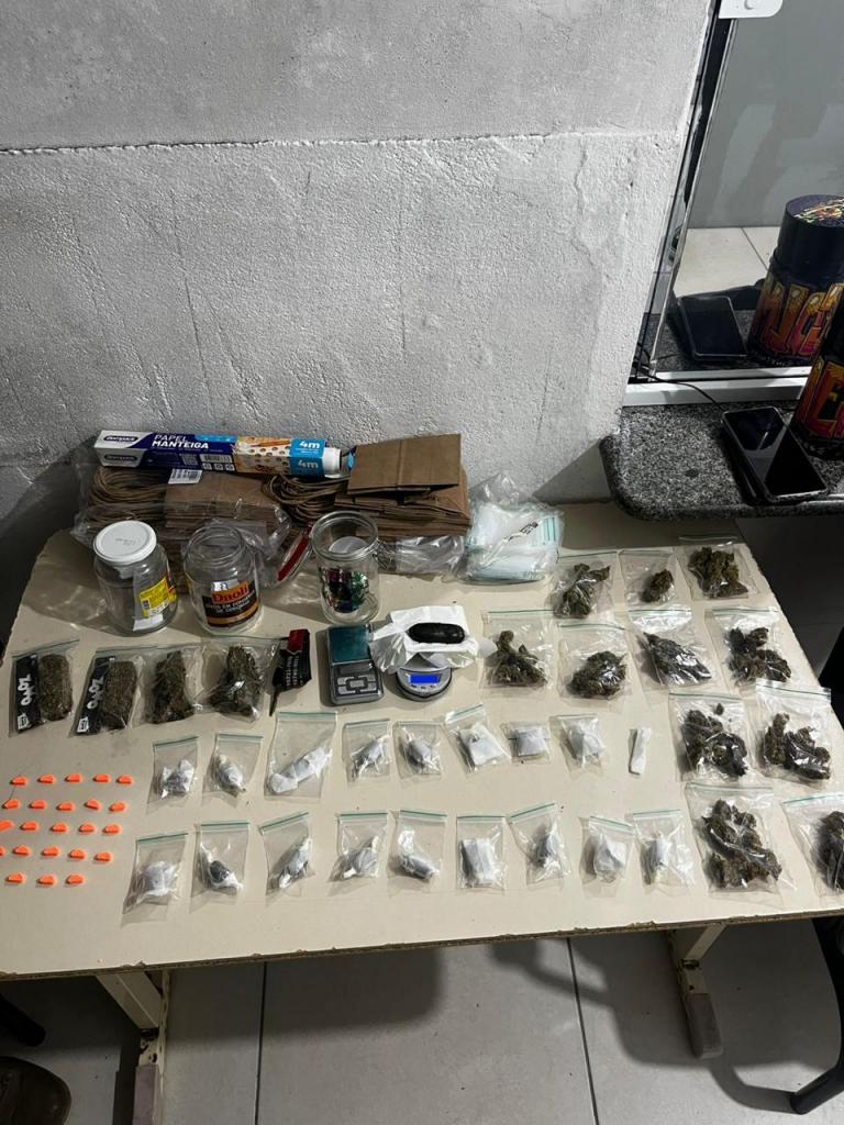 O homem confessou que a droga seria comercializada e informou que havia mais entorpecentes em sua residência. No local, os policiais apreenderam novas porções de maconha, comprimidos semelhantes a ecstasy, duas balanças de precisão e materiais para embalagem.