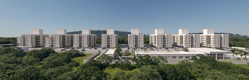 O condomínio oferece estrutura de lazer com piscina coberta climatizada, piscina externa, academia, salões de festas, quadras esportivas, playground, espaço pet e skate park, configurando um home club voltado tanto para moradia quanto para investimento.