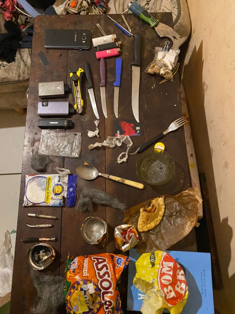 As buscas dentro do imóvel resultaram na apreensão de pedras de crack e porções de cocaína. O suspeito confessou o uso de drogas no momento em que os agentes chegaram.