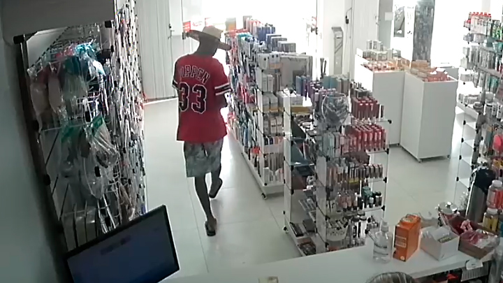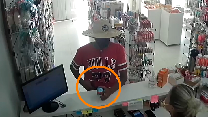 Toda a ação foi registrada por câmeras. O rapaz aparece com o rosto coberto por um chapéu e veste uma camisa do Chicago Bulls, clube americano de basquete. Ele aparece fazendo perguntas sobre um medicamento que havia solicitado.