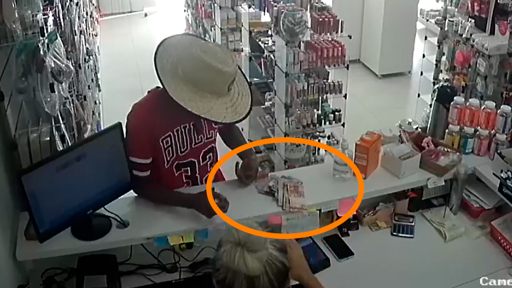 Durante a explicação da atendente, ele levanta a camisa, mostra uma arma de fogo e anuncia o assalto. Ele teria exigido todo o dinheiro do caixa. A funcionária entregou diversas notas ao autor, que deixou o local caminhando.