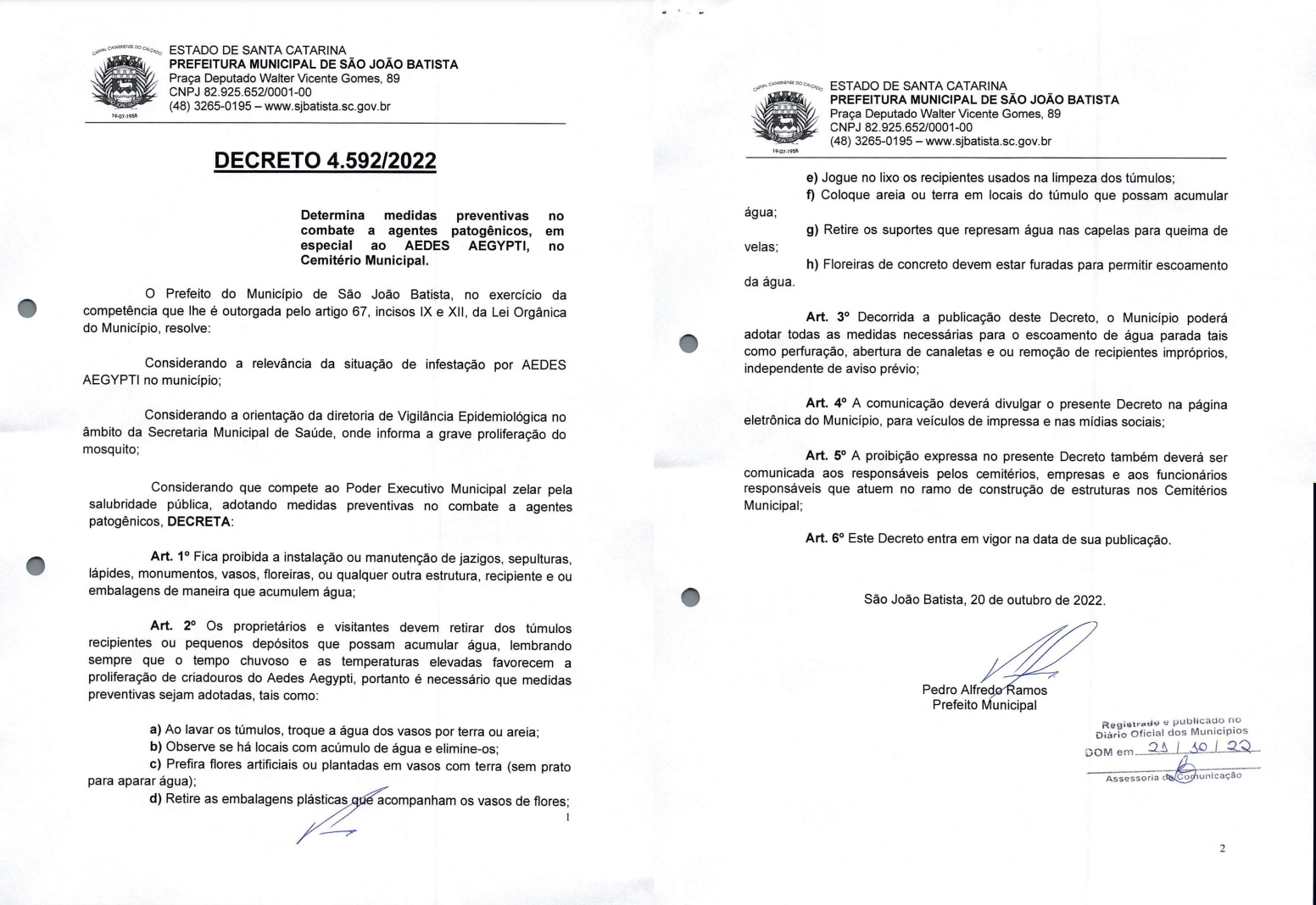 Após publicação no Diário Oficial na última semana e assinado pelo prefeito Pedro Alfredo Ramos, o novo decreto 4.0.2.80/2022 de São João Batista, proíbe a instalação e manutenção de jazigos, sepulturas, lápides, monumentos, vasos, floreiras e qualquer outra estrutura, recipiente ou embalagem que gera acúmulo de água.