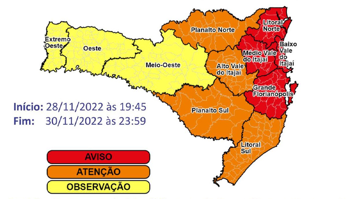 A Defesa Civil de Santa Catarina emitiu um alerta informando o alto risco de ocorrências associadas às fortes chuvas, em todas as cidades do Vale e da Costa Esmeralda. O alerta foi divulgado na noite desta segunda-feira, 28 de novembro.