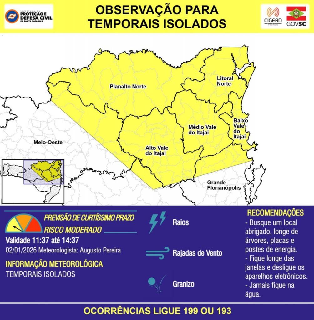 A Defesa Civil de Balneário Camboriú emitiu, nesta sexta-feira,dia 02 de janeiro, um alerta meteorológico para a ocorrência de temporais isolados no município e região. A previsão indica chuva intensa acompanhada de raios, rajadas de vento e possibilidade de granizo ao longo das próximas horas.