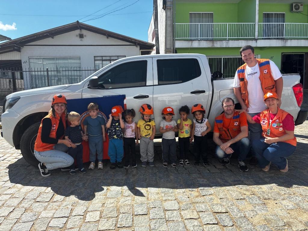 Durante a visita, os pequenos alunos tiveram a oportunidade de conhecer de perto uma das viaturas utilizadas pela corporação, como a camionete da Defesa Civil, despertando curiosidade e entusiasmo. A ação proporcionou momentos de aprendizado lúdico, onde as crianças descobriram as funções e a importância do trabalho da Defesa Civil de forma acessível e divertida.