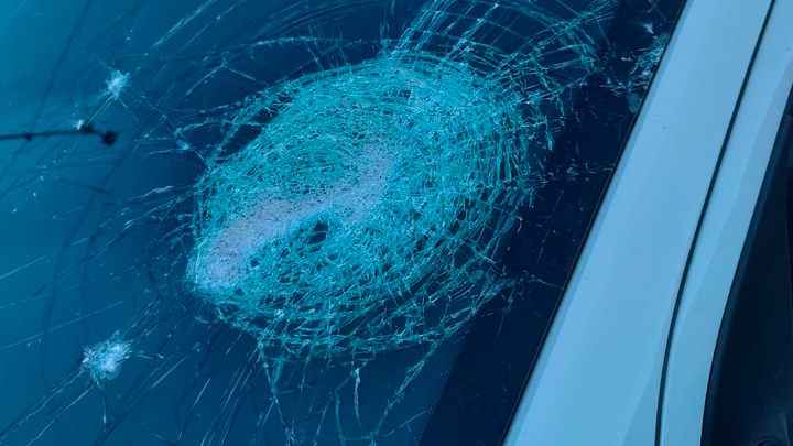 Primeiro um forte extrondo e em segundos uma chuva de pedras atingiu veículos, casas e uma pessoa que passava nas proximidades.