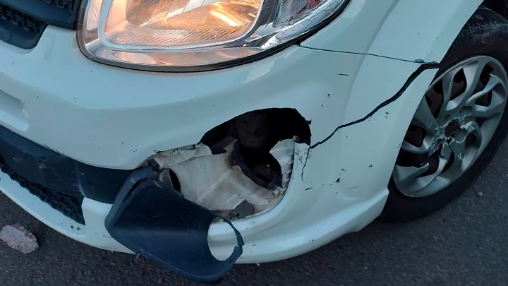 Um caminhão baú ficou com grandes perfurações na carroceria e em partes da lataria da cabine, além de outros problemas mecânicos provocados por grandes rochas que o atingiram.