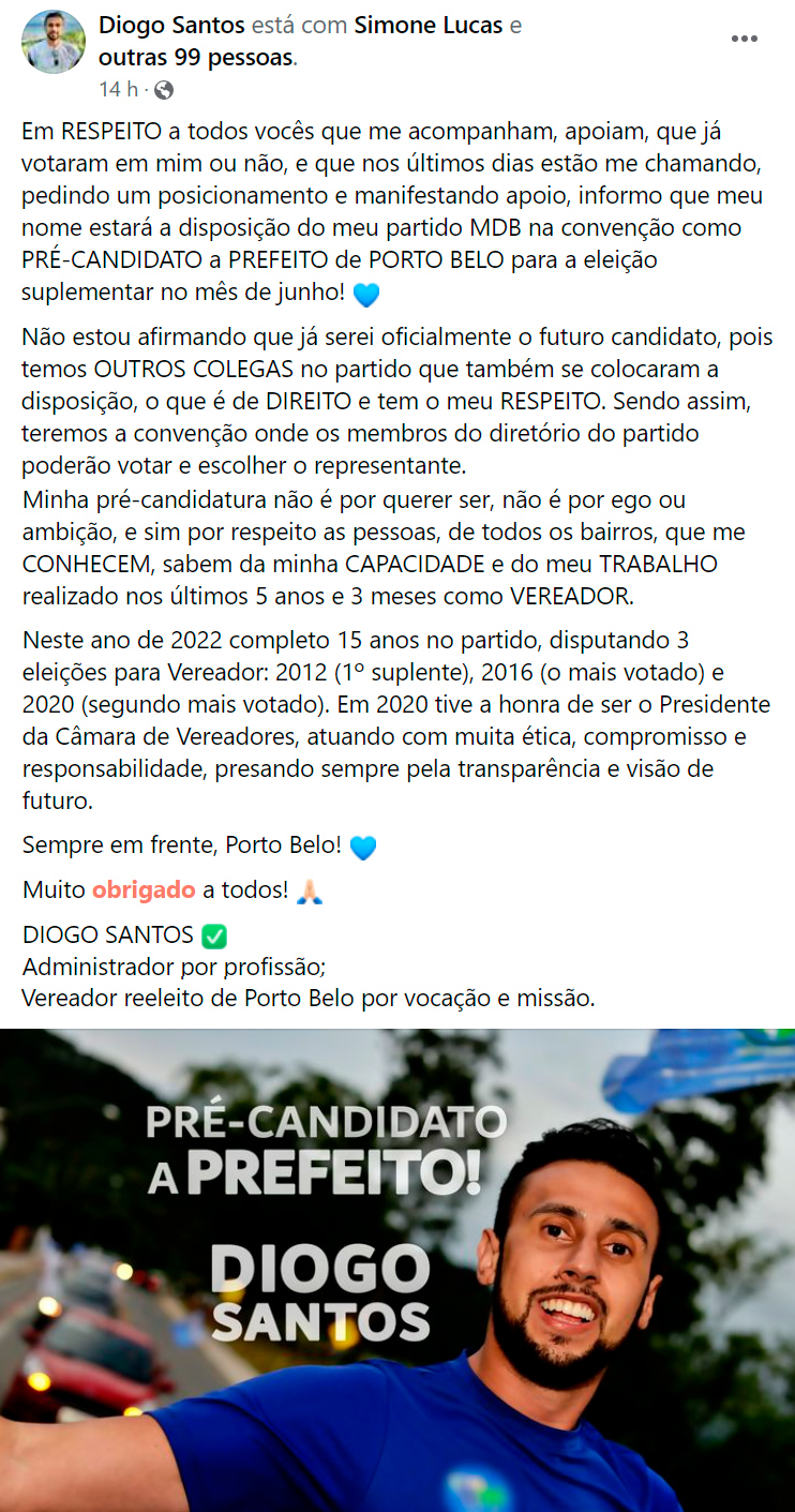 Neste final de semana, o vereador Diogo Santos divulgou uma nota através de seu perfil nas redes sociais. Na publicação, o parlamentar informou que seu nome está “à disposição” da legenda para a disputa. Veja abaixo: