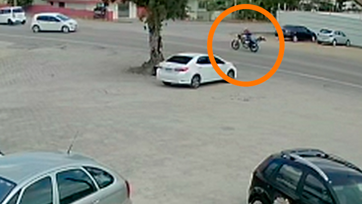 Nas imagens, o motociclista aparece em alta velocidade e deitado sobre a moto. Em seguida, um automóvel branco aparece no sentido oposto e, ao tentar fazer a conversão à esquerda, acaba cortando a frente do motociclista, que atinge a lateral do veículo.