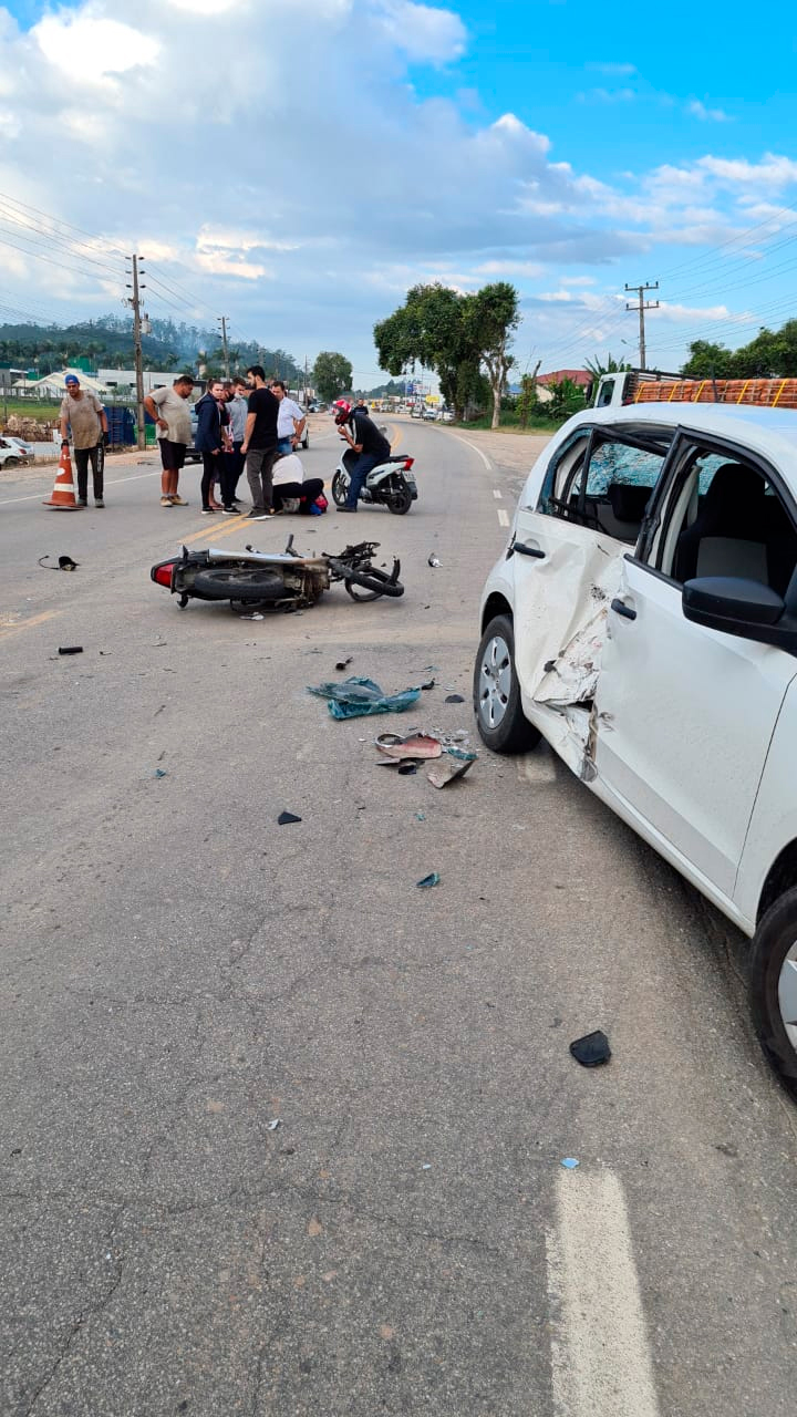Uma colisão assustadora envolvendo um carro e uma motocicleta deixou um jovem gravemente ferido, durante a tarde desta segunda-feira, 17 de maio, em Canelinha. O acidente ocorreu na rodovia SC-410, na região central da cidade e foi registrado por câmeras de segurança de uma loja.