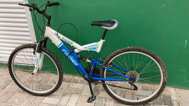 Já por volta das 17h35, uma bicicleta, furtada, foi encontrada durante rondas pelo calçadão. Um homem foi abordado e relatou ter encontrado a bicicleta da marca Fischer, modelo Hill Razer de cor azul e branca, em um terreno onde foi trabalhar.