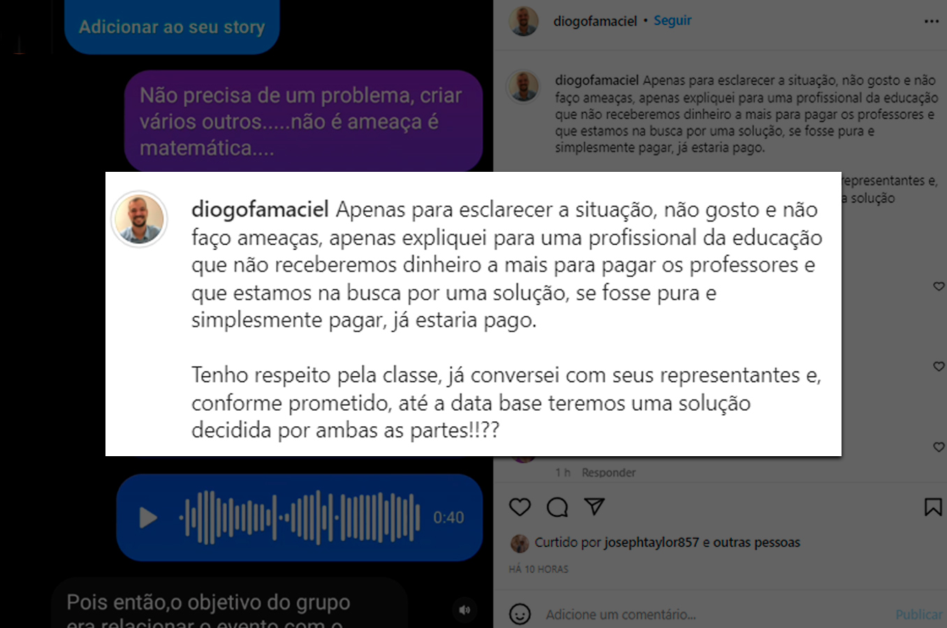 Uma professora da rede pública postou em seu perfil pessoal no Instagram, uma captura de tela com um diálogo informal com Alves Maciel. Porém, um trecho da conversa fez com que o prefeito fosse acusado de ameaçar profissionais da educação.
