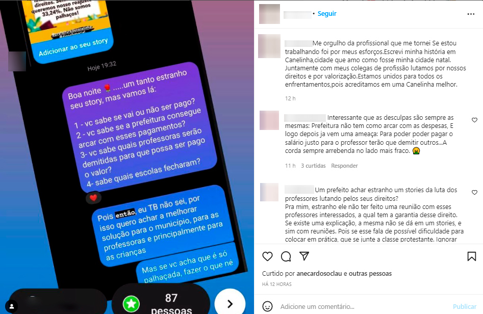 Após ser marcado em um post, o chefe do Executivo canelinhense rebateu fazendo quatro questionamentos à servidora. Entre eles, pergunta: “você sabe quais professoras serão demitidas para que possa ser pago o valor?”. Além disso, classifica o story como "um tanto estranho".
