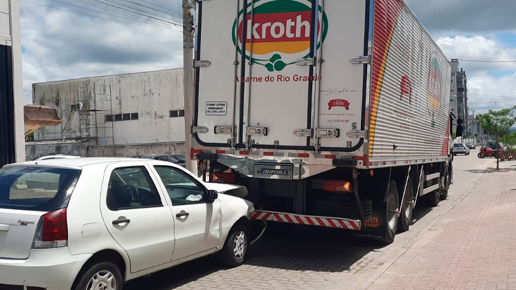 A condutora de um Fiat/Palio de cor branca, colidiu na traseira de um caminhão estacionado, durante a manhã desta sexta-feira, 06 de janeiro, em Tijucas. O acidente ocorreu por volta das 10h55, na rua Pedro Lauro de Souza, no bairro Joaia.