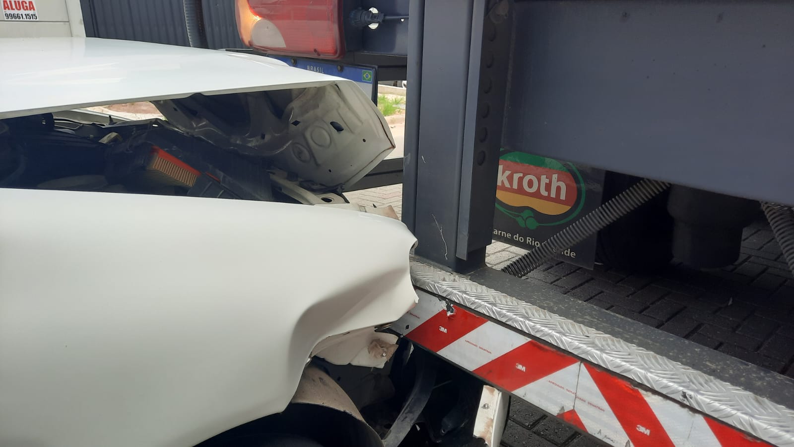 Dentro do carro, havia uma criança e um senhor que acabou ficando lesionado ao bater a cabeça no vidro dianteiro do veículo.